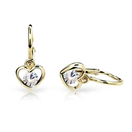 Dětské visací náušnice ze žlutého zlata ryzosti 585/000. Povrch náušnic je leštěný. Náušnice jsou zdobené srdíčkem s kamínkem. Průměr náušnic: 14mm, rozměr ozdoby 6*1,5mm. Náušnice mají bezpečnostní dětské zapínání. Krásné dětské náušnice od českého výrobce CUTIE JEWELLERY. Uvedená cena za 1 pár.