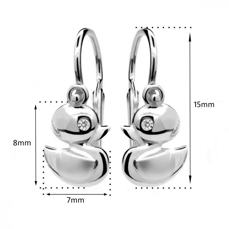 Dětské náušnice kachničky vyrobené z bílého zlata ryzosti 585/1000. Náušnice jsou navržené a vyrobené s ohledem na komfortní a bezpečné užívání pro miminka od nejútlejšího věku. Zapínání náušniček na dětskou brizuru zamezuje jejich snadnému otevření a následné ztrátě dětské náušničky. Kačenka má rozměr 7×8 mm, celková „výška“ náušničky 15 mm. Náušničky pro děti Cutie jsou dodávané v dárkové krabičce ve tvaru pyramidy.