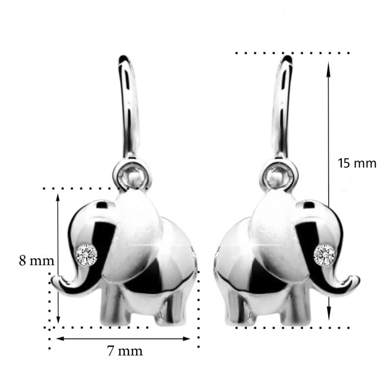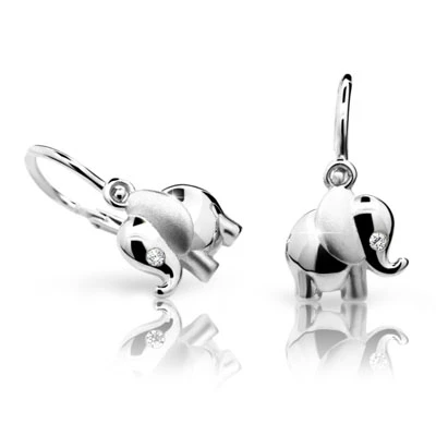 Dětské visací náušnice z bílého zlata ryzosti 585/000. Povrch náušnic je leštěný. Náušnice s ozdobou slona pro štěští. Slon je zdobený kamínkem . Průměr náušnic: 14mm, rozměr ozdoby 8*2mm. Náušnice mají bezpečnostní dětské zapínání. Krásné dětské náušnice od českého výrobce CUTIE JEWELLERY. Uvedená cena za 1 pár.