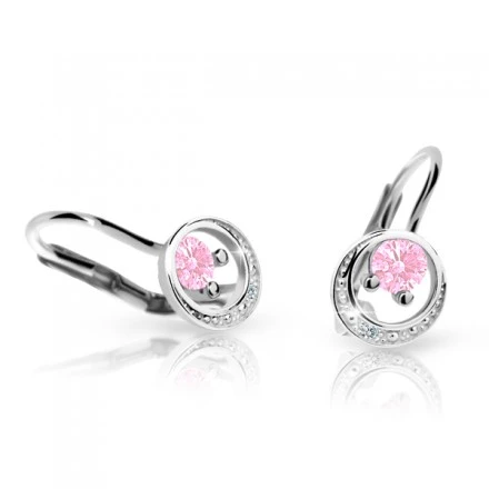 Dívčí náušničky z bílého zlata ryzosti 585/000. Náušničky pro děti se zapínáním na klapku, která zajišťuje snadnou manipulaci s náušničkami v případě potřeby. Ozdoba se zirkony má průměr 7,5mm, celková výška náušniček 14,4mm.