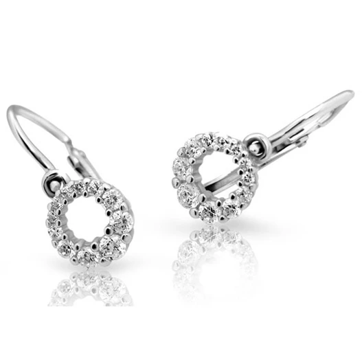 Dětské náušnice z bílého zlata ryzosti 585/000. Povrch náušnic je leštěný. Náušnice jsou zdobené kamínky. Průměr náušnic: 14mm, rozměr ozdoby 7*2mm. Náušnice mají bezpečnostní dětské zapínání. Krásné dětské náušnice od českého výrobce CUTIE JEWELLERY. Uvedená cena za 1 pár.