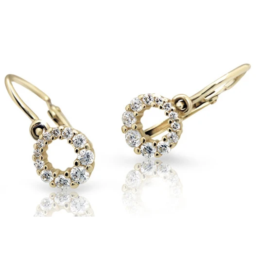 Dětské náušnice ze žlutého zlata ryzosti 585/000. Povrch náušnic je leštěný. Náušnice jsou zdobené kamínky. Průměr náušnic: 14mm, rozměr ozdoby 7*2mm. Náušnice mají bezpečnostní dětské zapínání. Krásné dětské náušnice od českého výrobce CUTIE JEWELLERY.