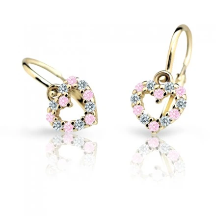 Dětské náušnice srdíčka vyrobené ze 14ti karátového zlata. Náušnice jsou navržené a vyrobené s ohledem na komfortní a bezpečné užívání pro miminka od nejútlejšího věku. Zapínání náušniček na dětskou brizuru zamezuje jejich snadnému otevření a následné ztrátě dětské náušničky. Srdíčko se zirkony má rozměr 6,5×6,0 mm, celková „výška“ náušničky 14,2 mm. Rozměry náušniček najdete zobrazené na přehledném podpůrném obrázku.