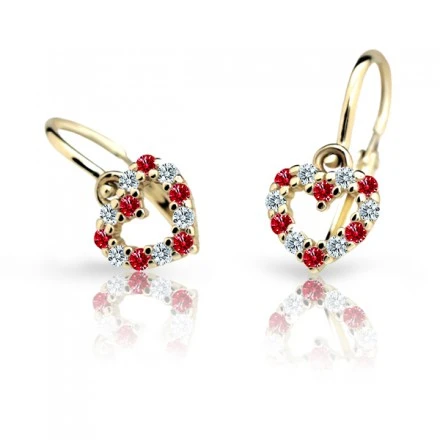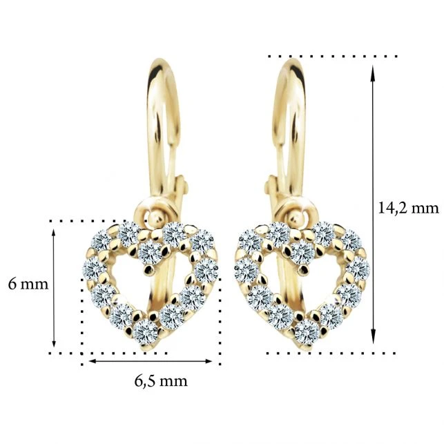 Dětské náušnice srdíčka vyrobené ze 14ti karátového zlata. Náušnice jsou navržené a vyrobené s ohledem na komfortní a bezpečné užívání pro miminka od nejútlejšího věku. Zapínání náušniček na dětskou brizuru zamezuje jejich snadnému otevření a následné ztrátě dětské náušničky. Srdíčko se zirkonem má rozměr 6,5×6,0 mm, celková „výška“ náušničky 14,2 mm. Rozměry náušniček najdete zobrazené na přehledném podpůrném obrázku.