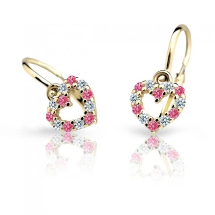 Dětské náušnice srdíčka vyrobené ze 14ti karátového zlata. Náušnice jsou navržené a vyrobené s ohledem na komfortní a bezpečné užívání pro miminka od nejútlejšího věku. Zapínání náušniček na dětskou brizuru zamezuje jejich snadnému otevření a následné ztrátě dětské náušničky. Srdíčko se zirkony má rozměr 6,5×6,0 mm, celková „výška“ náušničky 14,2 mm. Rozměry náušniček najdete zobrazené na přehledném podpůrném obrázku.