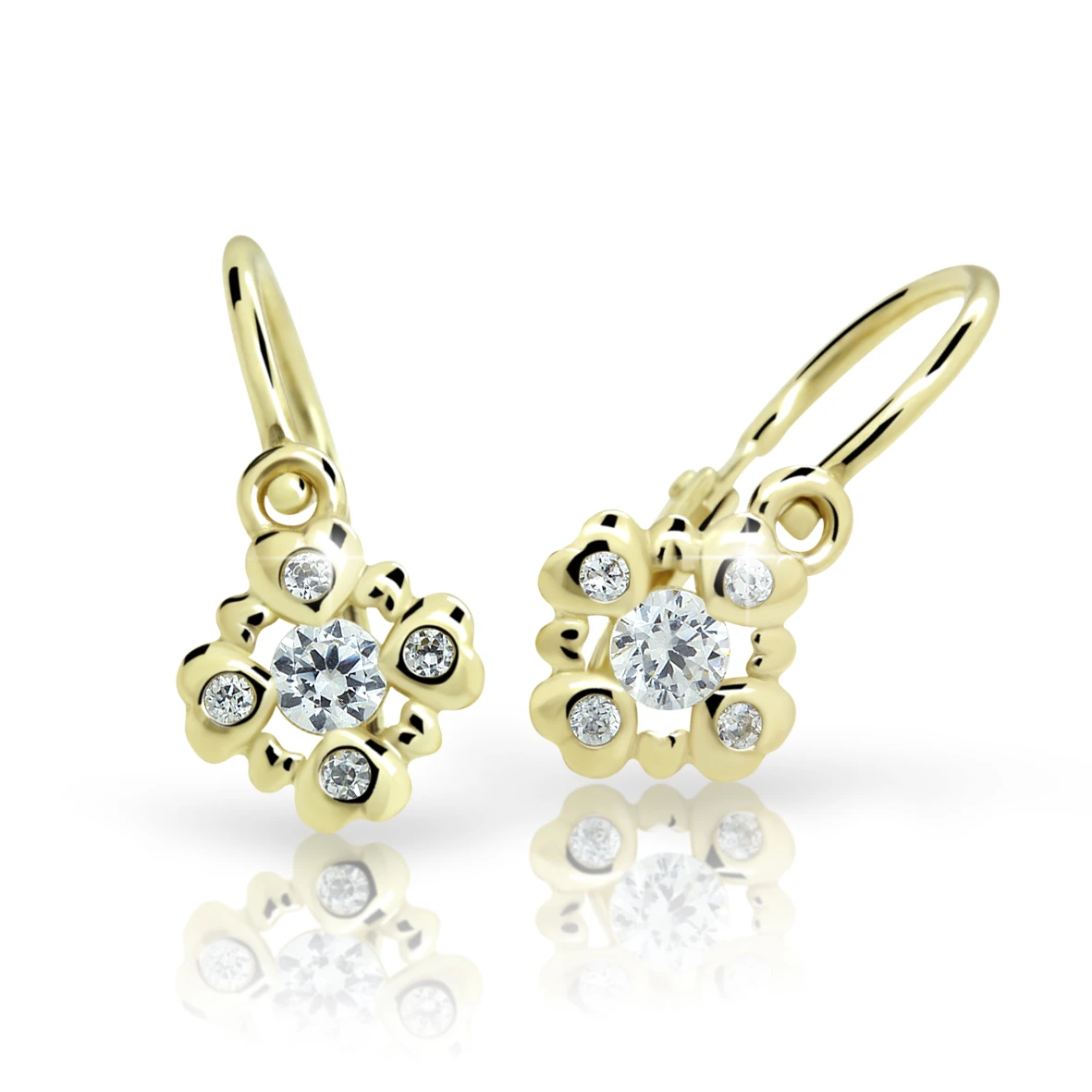 Náušnice pro děti ze zlata 585/000. Nádherné náušničky pro miminka se zapínáním na dětskou brizuru, která dětem zabraňuje v jejich snadném otevření. Luxusní vzhled dětských náušnic je podtržený zářivými kamínky. Všechny dětské šperky od Cutie Jewellery jsou vyráběné České republice a dnes jsou tyto šperky známé po téměř po celém světě. Tak jako všechny zlaté šperky jsou také tyto náušničky pro miminka opuncované dle puncovního zákona. K náušničkám patří originální krabička Cutie Jewellery.