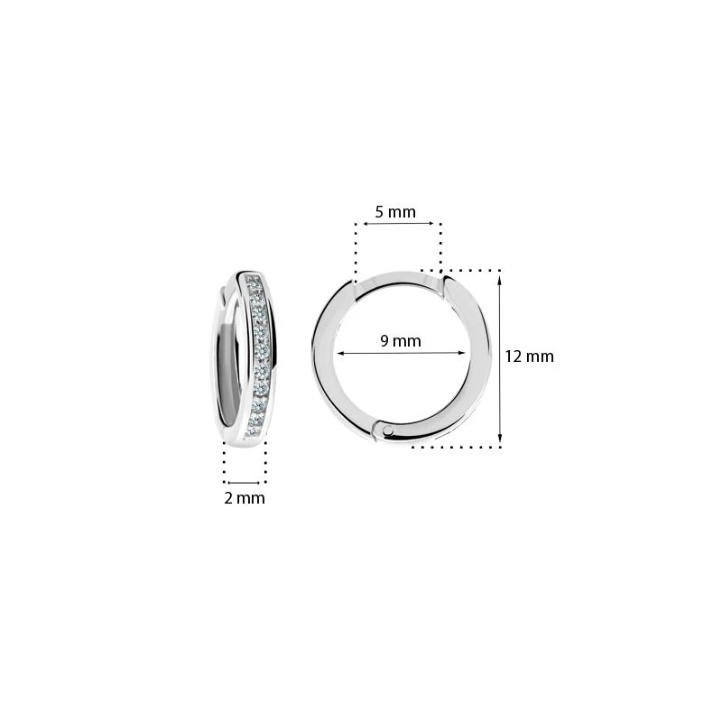 Dětské náušnice z bílého zlata 585/000 ve tvaru kroužku. Praktický kruhový tvar dětských náušniček je zárukou jejich pohodlného užívání jak pro miminka tak pro větší parádnice školou povinné. Vnější průměr náušniček 12 mm, vnitřní průměr 9 mm. Kroužky jsou široké 2,0 mm. Dřík zapínání je dlouhý 5 mm.