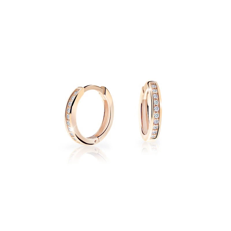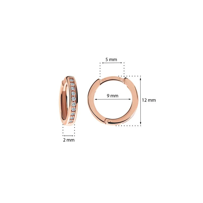 Dětské náušnice z růžového zlata 585/000 ve tvaru kroužku. Praktický kruhový tvar dětských náušniček je zárukou jejich pohodlného užívání jak pro miminka tak pro větší parádnice školou povinné. Vnější průměr náušniček 12 mm, vnitřní průměr 9 mm. Kroužky jsou široké 2,0 mm. Dřík zapínání je dlouhý 5 mm.
