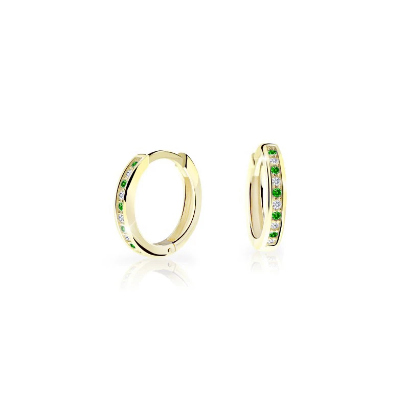 Dětské náušnice ze žlutého zlata 585/000 ve tvaru kroužku. Praktický kruhový tvar dětských náušniček je zárukou jejich pohodlného užívání jak pro miminka tak pro větší parádnice školou povinné. Vnější průměr náušniček 12 mm, vnitřní průměr 9 mm. Kroužky jsou široké 2,0 mm. Dřík zapínání je dlouhý 5 mm.