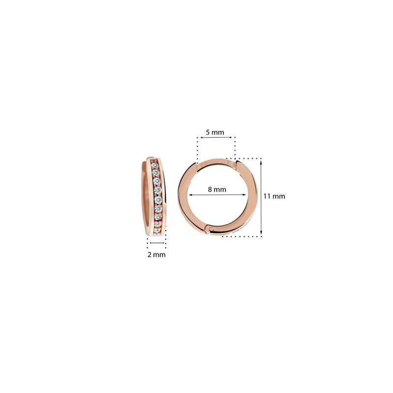 Dětské náušnice kroužky z růžového zlata. Praktický kruhový tvar dětských náušniček je zárukou jejich pohodlného užívání. Vnější průměr náušniček 11 mm, vnitřní průměr 8 mm. Kroužky jsou široké 2,0 mm. Dřík zapínání je dlouhý 5 mm.
