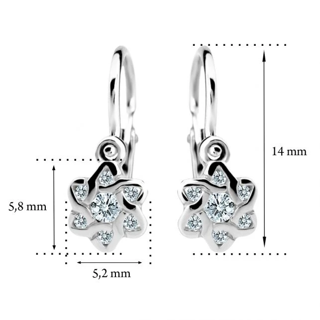 Dětské náušnice vyrobené ze 14ti karátového zlata se zirkony. Náušnice jsou navržené a vyrobené s ohledem na komfortní a bezpečné užívání pro miminka od nejútlejšího věku. Zapínání náušniček na dětskou brizuru zamezuje jejich snadnému otevření a následné ztrátě dětské náušničky. Kytička se zirkony má rozměr 5,8×5,2 mm, celková „výška“ náušničky 14 mm. Rozměry náušniček najdete zobrazené na přehledném podpůrném obrázku.