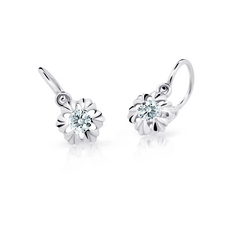 Dětské náušnice z bílého zlata 585/1000. Náušničky mají zapínání na dětskou brizuru. Toto zapínání je zkonstruované právě pro dětské náušnice a zamezuje jeho nechtěnému rozevření a následné ztrátě náušničky. Rozměry náušniček 14mm x 7,6mm x 6,2mm najdete zobrazené na podpůrné fotografii. Náušničky jsou ozdobené zářivými zirkony.