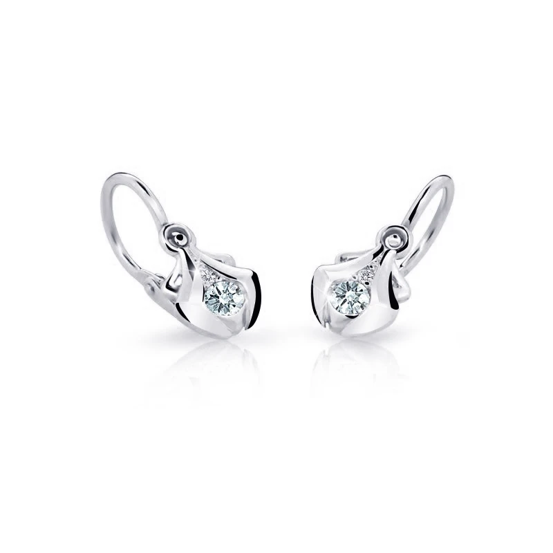 Dětské náušnice z bílého zlata 585/1000. Náušničky mají zapínání na dětskou brizuru. Toto zapínání, je zkonstruované právě pro dětské náušnice, zamezuje jeho nechtěnému rozevření a následné ztrátě náušničky. Rozměry náušniček 13mm x 5,8mm x 5,7mm najdete zobrazené na podpůrné fotografii. Náušničky jsou ozdobené zářivými zirkony.