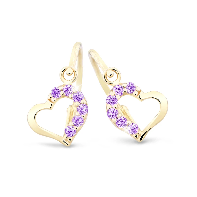 Dětské náušnice ze žlutého zlata 585/1000. Náušničky mají zapínání na dětskou brizuru. Toto zapínání je zkonstruované právě pro dětské náušnice a zamezuje jeho nechtěnému rozevření a následné ztrátě náušničky. Rozměry náušniček 14mm x 7mm x 7mm najdete zobrazené na podpůrné fotografii. Náušničky jsou ozdobené zářivými zirkony.