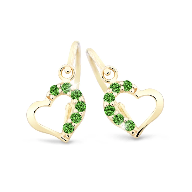 Dětské náušnice ze žlutého zlata 585/1000. Náušničky mají zapínání na dětskou brizuru. Toto zapínání je zkonstruované právě pro dětské náušnice a zamezuje jeho nechtěnému rozevření a následné ztrátě náušničky. Rozměry náušniček 14mm x 7mm x 7mm najdete zobrazené na podpůrné fotografii. Náušničky jsou ozdobené zářivými zirkony.