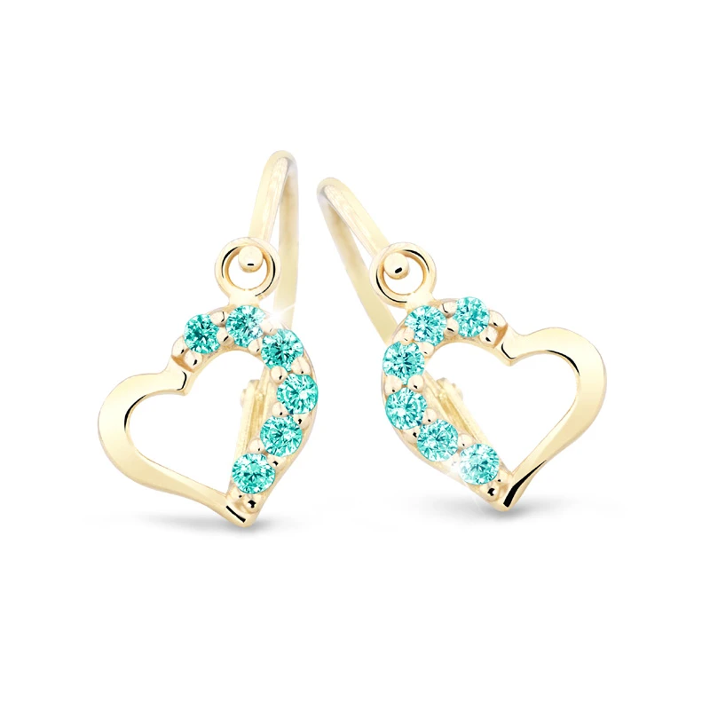 Dětské náušnice ze žlutého zlata 585/1000. Náušničky mají zapínání na dětskou brizuru. Toto zapínání je zkonstruované právě pro dětské náušnice a zamezuje jeho nechtěnému rozevření a následné ztrátě náušničky. Rozměry náušniček 14mm x 7mm x 7mm najdete zobrazené na podpůrné fotografii. Náušničky jsou ozdobené zářivými zirkony.