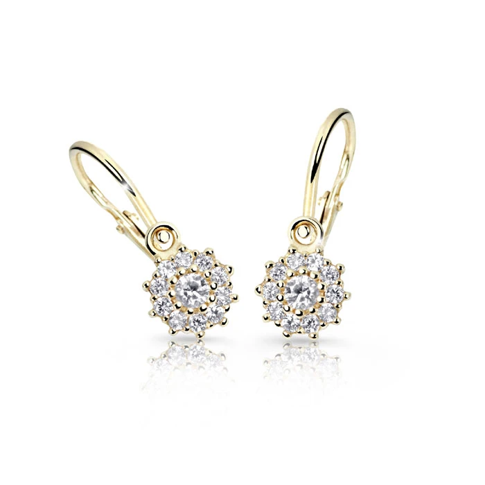 Zlaté dětské náušnice ze žlutého zlata ryzosti 585/000. Dětské náušničky ozdobené zářivými kamínky. Náušnice pro miminko se zapínáním na bezpečností dětskou brizuru. Průměr ozdobné části náušnic 5,5 mm, celková výška náušniček 13 mm.