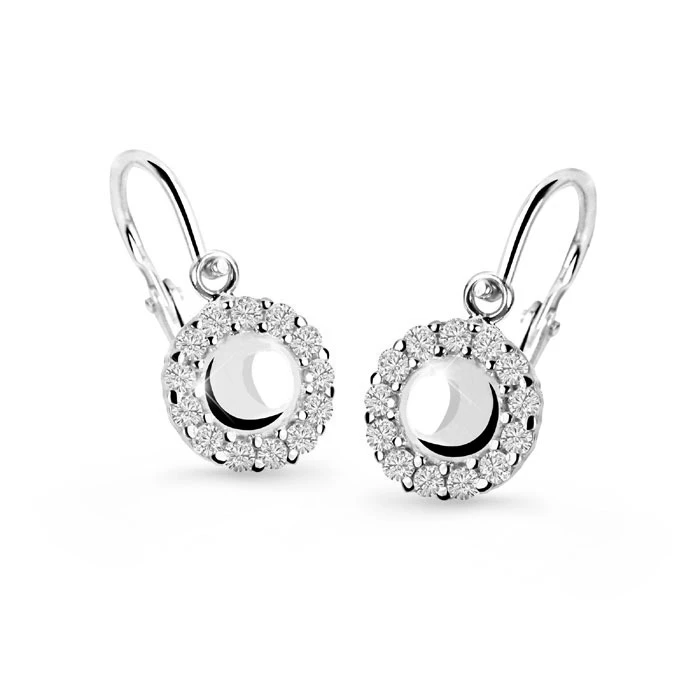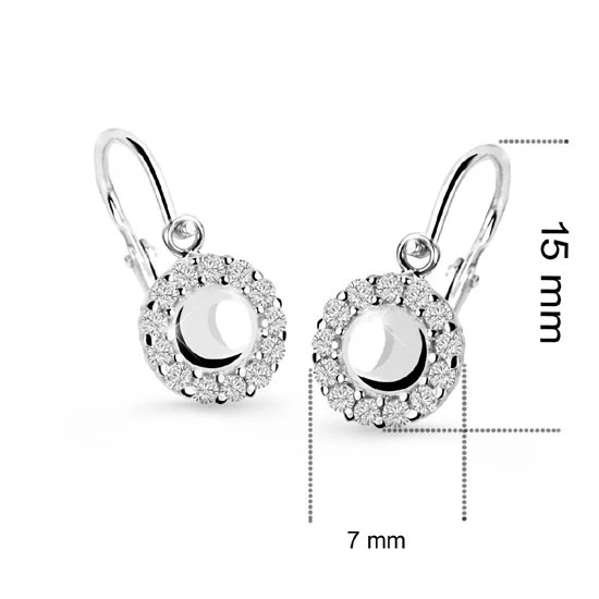 Zlaté dětské náušnice z bílého zlata ryzosti 585/000. Dětské náušničky ozdobené zářivými kamínky. Náušnice pro miminko se zapínáním na bezpečností dětskou brizuru. Průměr ozdobné části náušnic 7 mm, celková výška náušniček 15 mm.