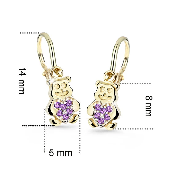 Zlaté dětské náušnice ze žlutého zlata ryzosti 585/000. Dětské náušničky ozdobené zářivými zirkony. Náušnice pro miminko se zapínáním na bezpečností dětskou brizuru. Rozměr ozdobné části náušnic 8x5 mm, celková výška náušniček 14 mm.