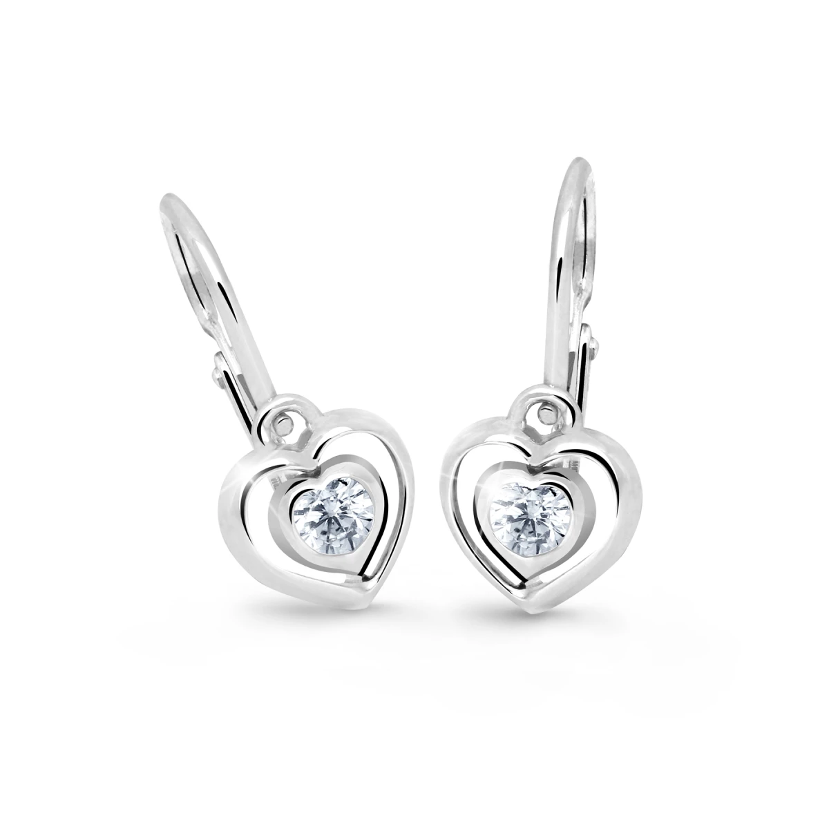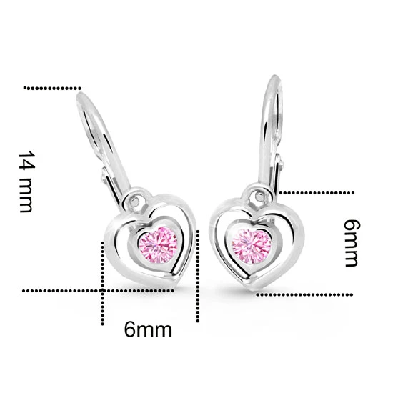 Zlaté dětské náušnice srdíčka z bílého zlata ryzosti 585/000. Dětské náušničky ozdobené zářivým kamínkem. Dětské naušnice se zapínáním na bezpečností dětskou brizuru. Rozměr srdíčka 6x6 mm, celková výška náušniček 14 mm. Rozměry náušniček najdete na přehledné podpůrné fotografii.