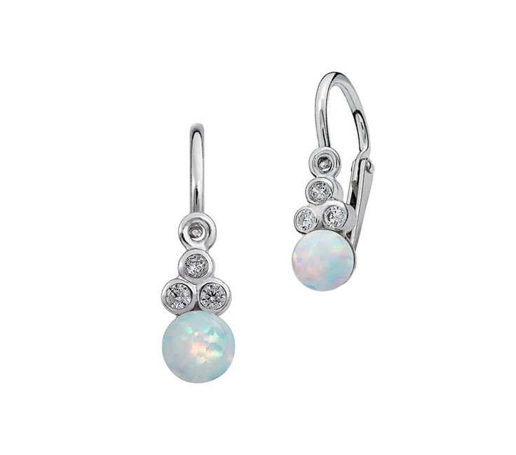 Dětské náušnice ze zlata ryzosti 585/000 ozdobené zirkony a kulatým bílým opálem s průměrem 4mm. Zlaté dětské náušnice s náušnicovým zapínáním na dětskou brizuru. Náušnicové zapínání na brizuru je zkonstruované tak, aby jeho otevření malou princeznou bylo téměř nemožné. Velikost náušniček 17x4mm.