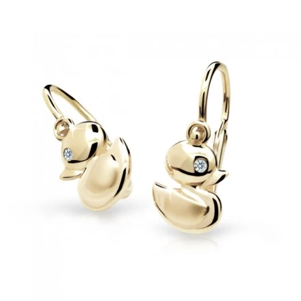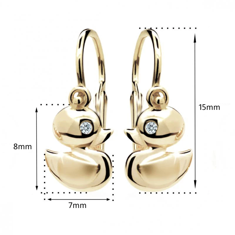 Dětské náušnice kachničky vyrobené ze žlutého zlata ryzosti 585/1000. Náušnice jsou navržené a vyrobené s ohledem na komfortní a bezpečné užívání pro miminka od nejútlejšího věku. Zapínání náušniček na dětskou brizuru zamezuje jejich snadnému otevření a následné ztrátě dětské náušničky. Kačenka má rozměr 7×8 mm, celková „výška“ náušničky 15 mm. Náušničky pro děti Cutie jsou dodávané v dárkové krabičce ve tvaru pyramidy.