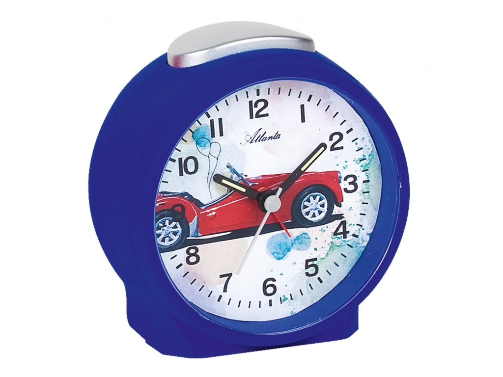 Dětský budík s autíčkem. Budík má hodinovou, minutovou a vteřinovou ručku. Stlačením stříbrného tlačítka na vršku budíku dojde k osvětlení ciferníku. Budík má funkci alarmu s rostoucí intenzitou. Spuštěný alarm pípá. Průměr ciferníku 80 mm. Výška budíku 100 mm, šířka 95 mm, hloubka 60 mm. Pohon budíku je bateriový na 1 baterii typu AA. Baterie je součástí balení.