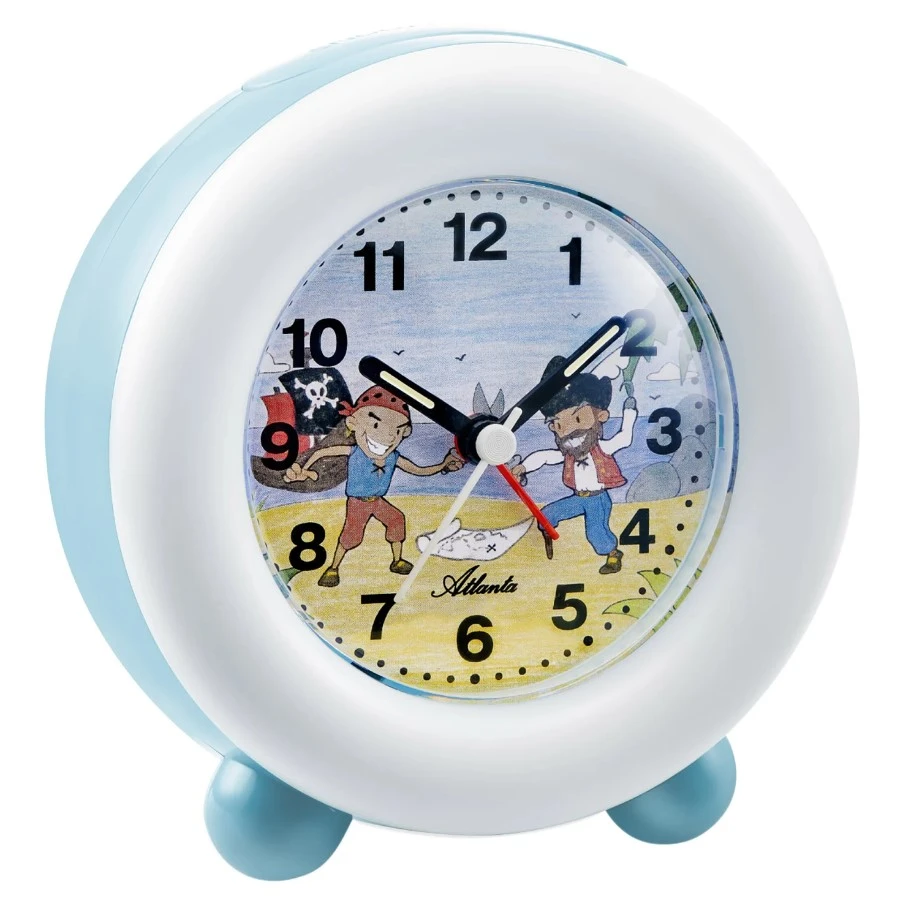 Dětský budík s obrázkem smějících se pirátů. Budíček je vybavený hodinovou, minutovou a vteřinovou ručičkou. Číselník s arabskými číslicemi je černý. Budíček disponuje funkcí alarmu a osvětlením. Provoz zajišťuje tichý strojek na dvě baterie typu AA. Rozměry budíčku v/š/h: 120mm/110mm/58mm. Baterie AA jsou součástí balení.