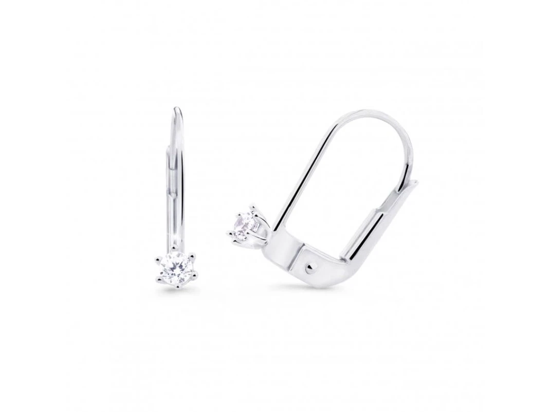 Diamantové náušnice visací z bílého zlata 585/1000 osazené pravými certifikovanými diamanty. Náušnicové zapínání je na klapku. Diamanty zasazené v náušnicích mají hmotnost 0,120 ct. Kvalita diamantů SI1, barva G je hodnocena na základě tvz, 4C tříd: