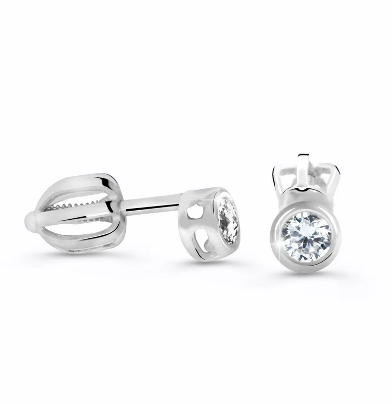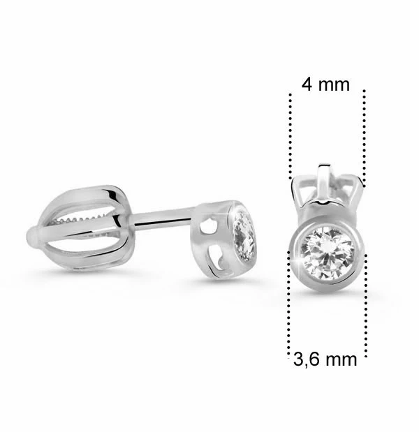 Diamantové náušnice pecky z bílého zlata 585/1000 na šroubek osazené pravými certifikovanými diamanty. Rozměry náušnic najdete vyobrazené na podpůrné fotografii. Diamanty zasazené v náušnicích mají hmotnost 0,200 ct. Kvalita diamantů SI1, barva G je hodnocena na základě tvz, 4C tříd: