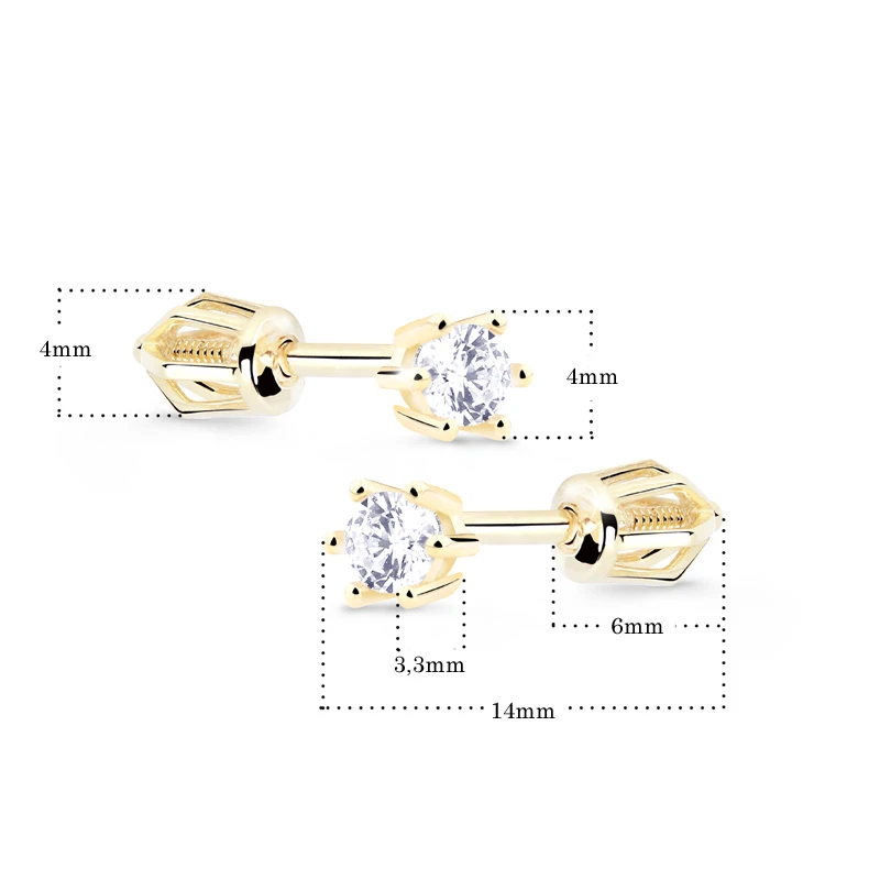 Diamantové náušnice pecky ze žlutého zlata 585/1000 na šroubek osazené pravými certifikovanými diamanty. Rozměry náušnic najdete vyobrazené na podpůrné fotografii. Diamanty zasazené v náušnicích mají hmotnost 0,200 ct. Kvalita diamantů SI1, barva G je hodnocena na základě tvz, 4C tříd: