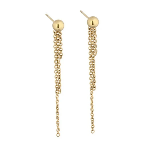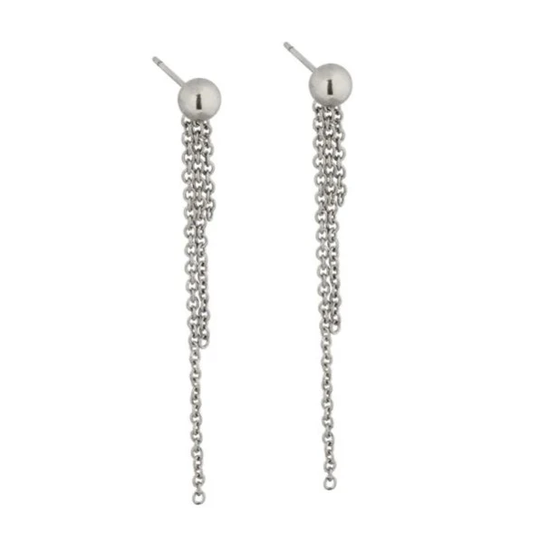 Visací náušnice z chirurgické oceli s řetízkem. Náušnice tvoří pecky o průměru 5mm a trojitý řetízek, který je navlečený na dřík zapínání. Náušnice je tedy možné použít jako pecky, nebo jako visací náušnice s řetízky. Řetízky jsou široké 0,9mm. Délky řetízků 50,30,20mm. Uvedená cena platí za pár náušnic.