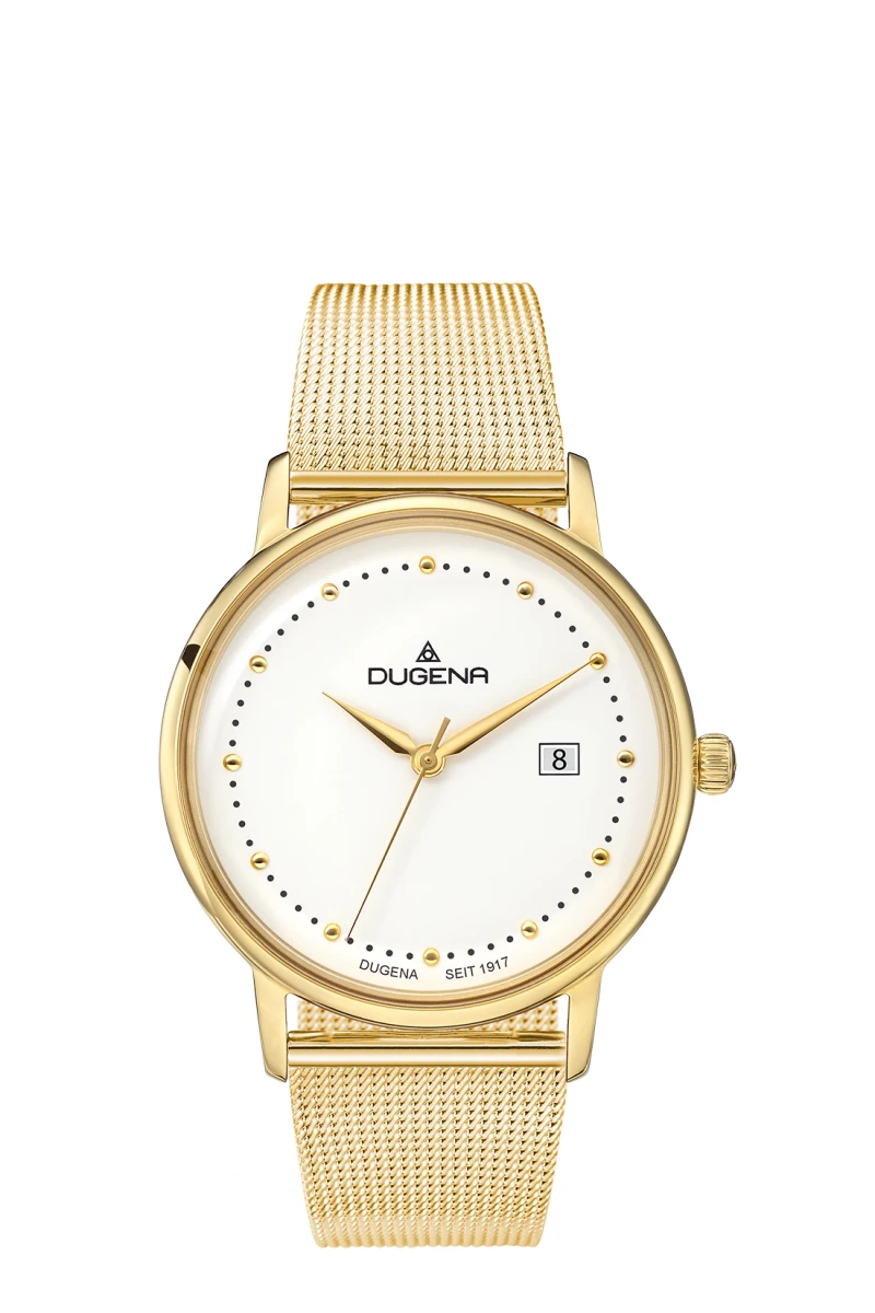 Dámské náramkové hodinky Dugena z chirurgické oceli s milánským tahem, sklíčko hodinek je minerální. Kulatý bílý ciferník s indexy. Hodinky jsou vybavené datumkou, hodinovou, minutovou a vteřinovou ručkou. Velikost pouzdra 38,5 x 9,5 mm. Povrch hodinek je pozlacený žlutým zlatem technologií PVD. Chod hodinek zajišťuje spolehlivý bateriový strojek. Hodinky jsou vodotěsné na úrovni 3 ATM. Na všechny dámské hodinky Dugena platí záruka v délce 36 měsíců. Hodinky jsou dodávané v dárkové krabičce s logem.