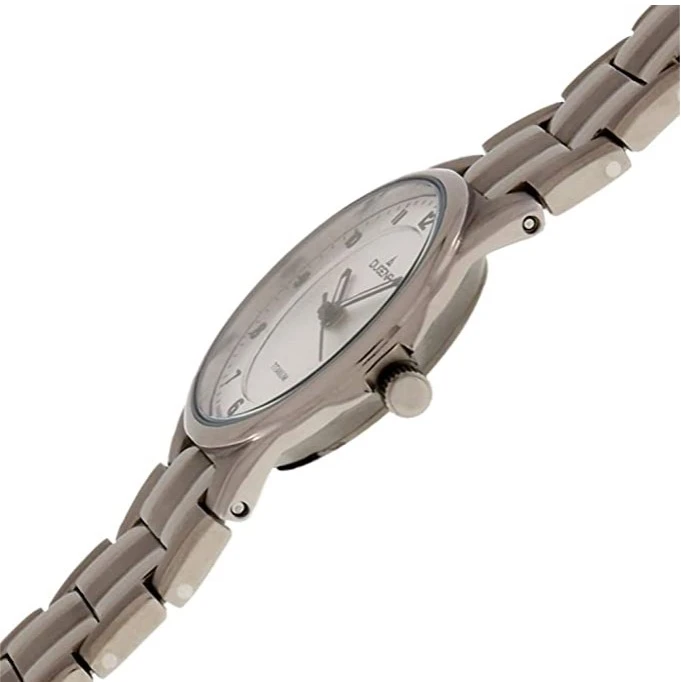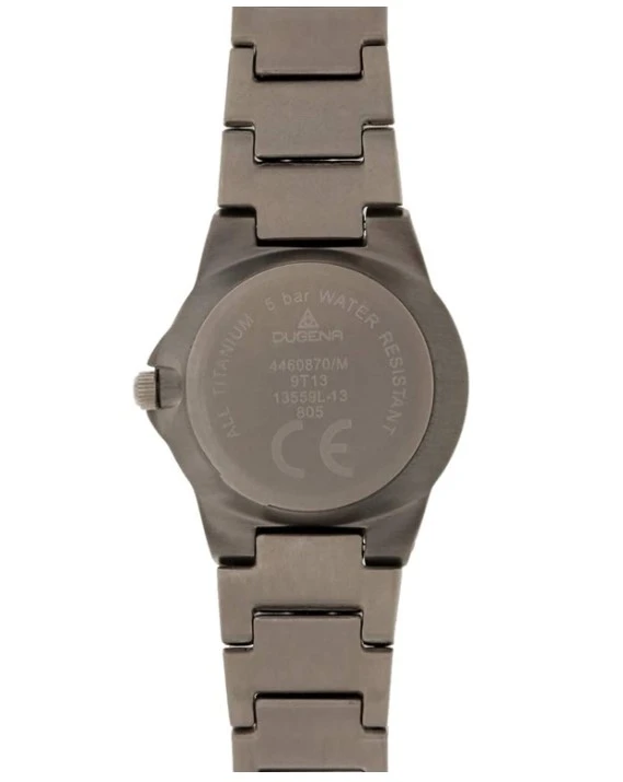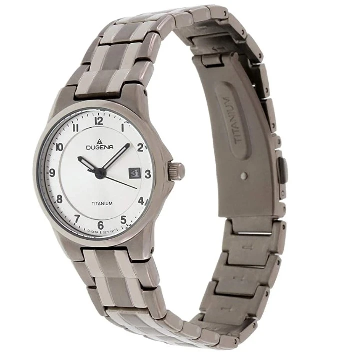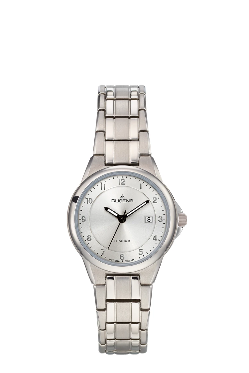 Titanové dámské hodinky Dugena. Hodinky jsou vyrobené z titanu, sklíčko hodinek je minerální. Kulatý stříbrný ciferník s arabskými čísly a ukazatelem data. Hodinky mají hodinovou, minutovou a vteřinovou ručku. Rozměr pouzdra 28x7 mm. Chod hodinek zajišťuje spolehlivý bateriový strojek. Hodinky jsou vodotěsné na úrovni 5 ATM. Na všechny dámské hodinky Dugena platí záruka v délce 36 měsíců. Hodinky jsou dodávané v dárkové krabičce s logem.