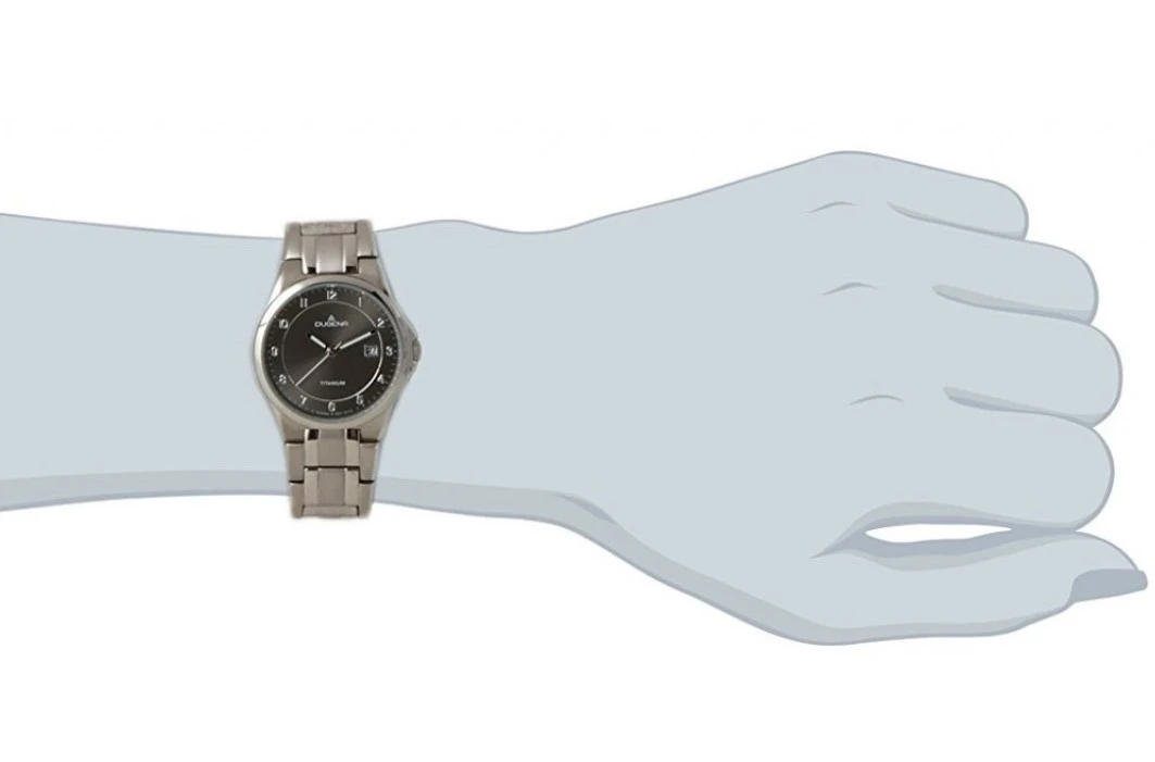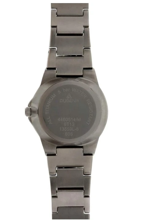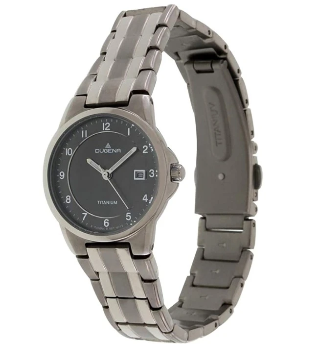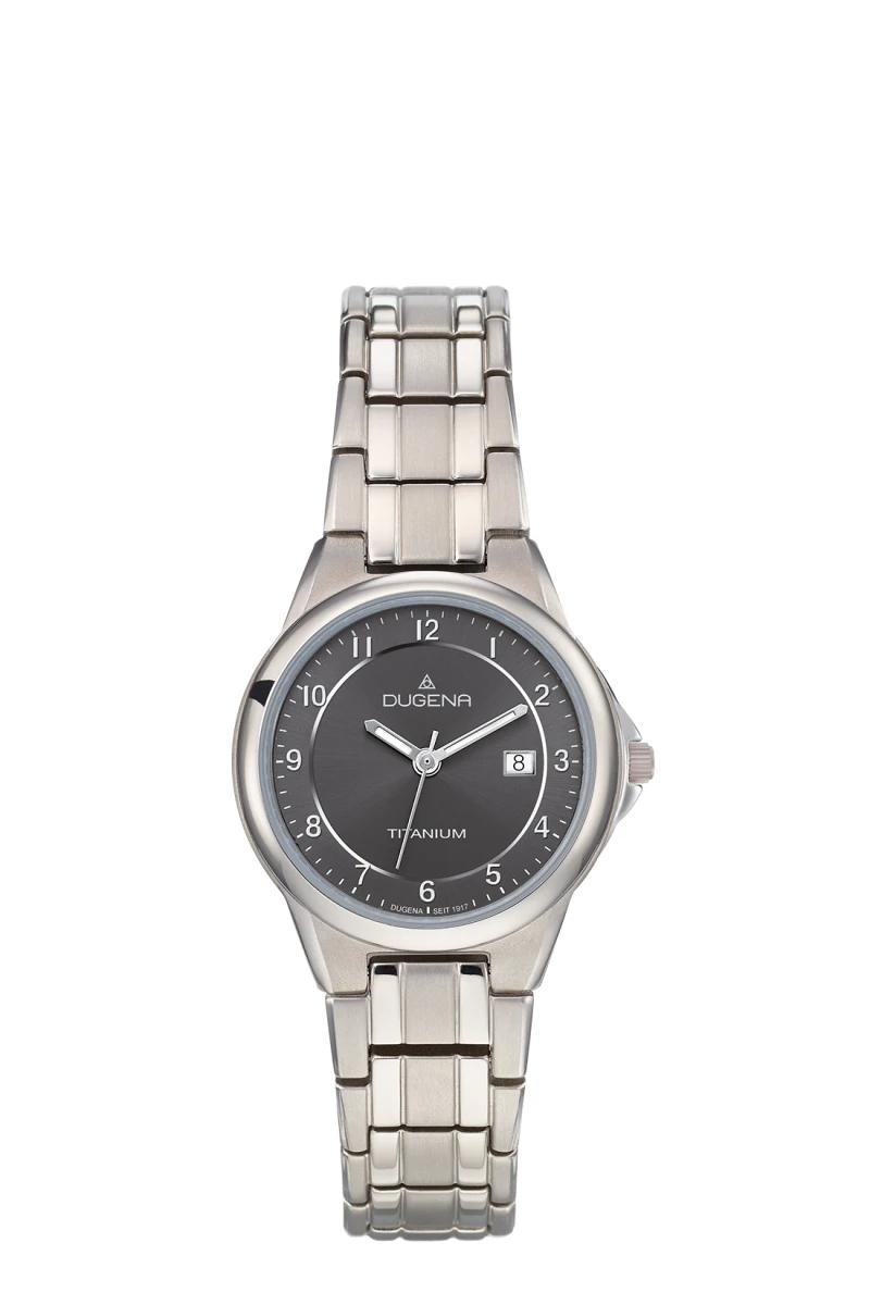 Titanové dámské hodinky Dugena. Hodinky jsou vyrobené z titanu, sklíčko hodinek je minerální. Kulatý černý ciferník s arabskými čísly a ukazatelem data. Hodinky mají hodinovou, minutovou a vteřinovou ručku. Rozměr pouzdra 28x7 mm. Chod hodinek zajišťuje spolehlivý bateriový strojek. Hodinky jsou vodotěsné na úrovni 5 ATM. Na všechny dámské hodinky Dugena platí záruka v délce 36 měsíců. Hodinky jsou dodávané v dárkové krabičce s logem.