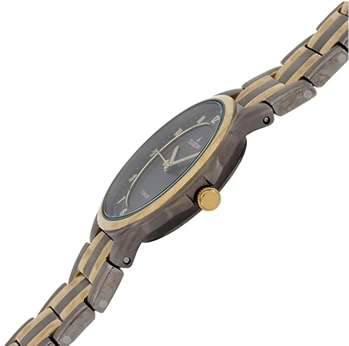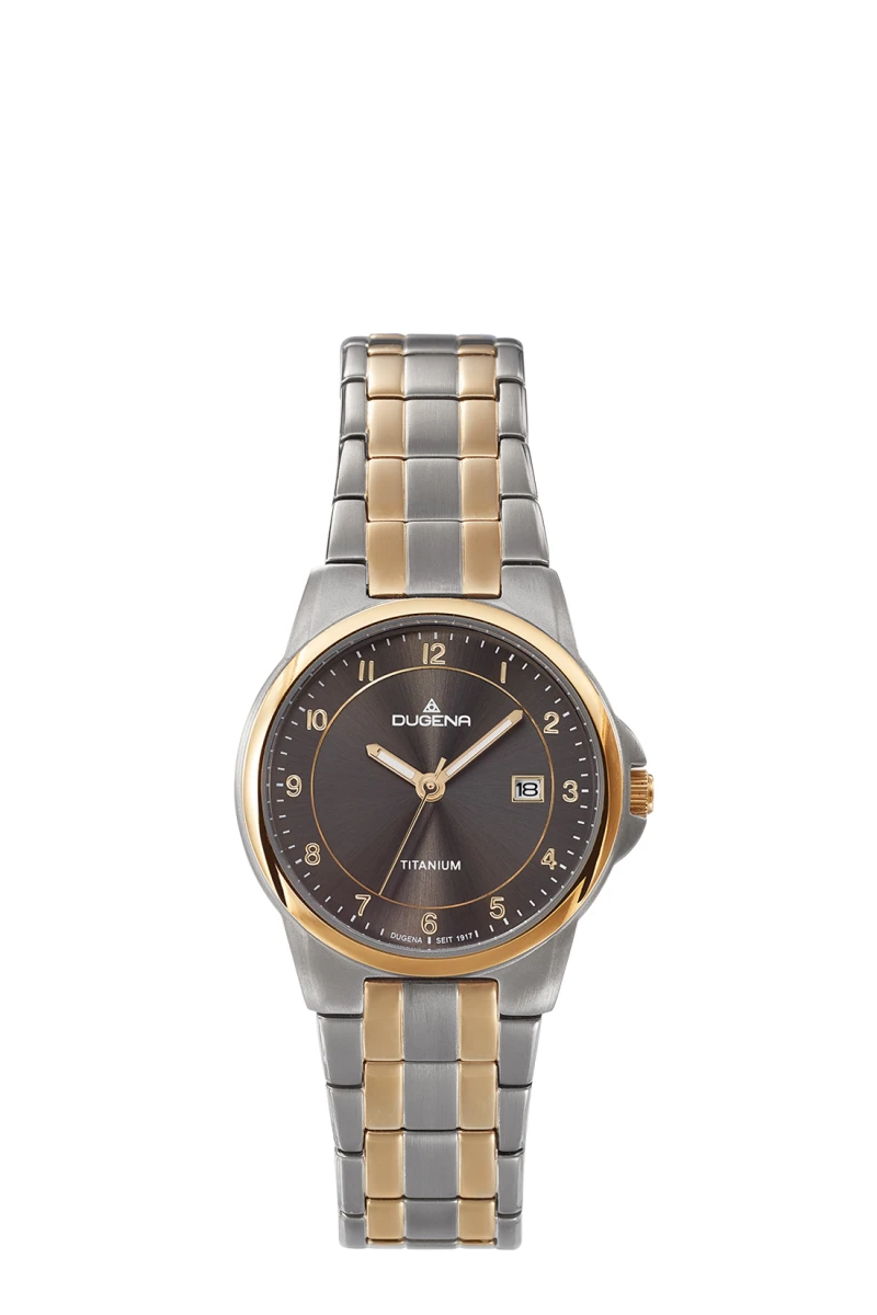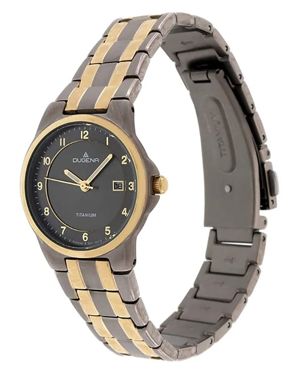 Titanové dámské hodinky Dugena. Hodinky jsou vyrobené z titanu, sklíčko hodinek je minerální. Kulatý černý ciferník s arabskými čísly a ukazatelem data. Hodinky mají hodinovou, minutovou a vteřinovou ručku. Rozměr pouzdra 28x7 mm. Chod hodinek zajišťuje spolehlivý bateriový strojek. Hodinky jsou vodotěsné na úrovni 5 ATM. Zlaté prvky jsou pozlacené žlutým zlatem technologií IP. Na všechny dámské hodinky Dugena platí záruka v délce 36 měsíců. Hodinky jsou dodávané v dárkové krabičce s logem.