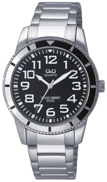 Hodinky pánské Q+Q. Pánské hodinky pohání bateriový strojek. Hodinky mají hodinovou, minutovou a vteřinovou ručičku. Průměr ciferníku 32mm, rozměr kovového pouzdra 49×40mm. Kovový tah je široký 18mm. Náramkové hodinky pánské dodávané v plastové krabičce s průhledným víčkem.
