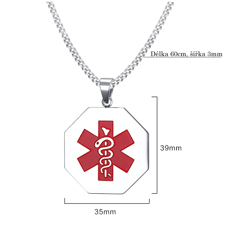 Identifikační známka z chirurgické oceli se záchranářským znakem. Povrch známky je matný. Rozměr známky 39x35mm. Ke známce náleží řetízek z chirurgické oceli dlouhý 60cm se zapínáním na karabinu.