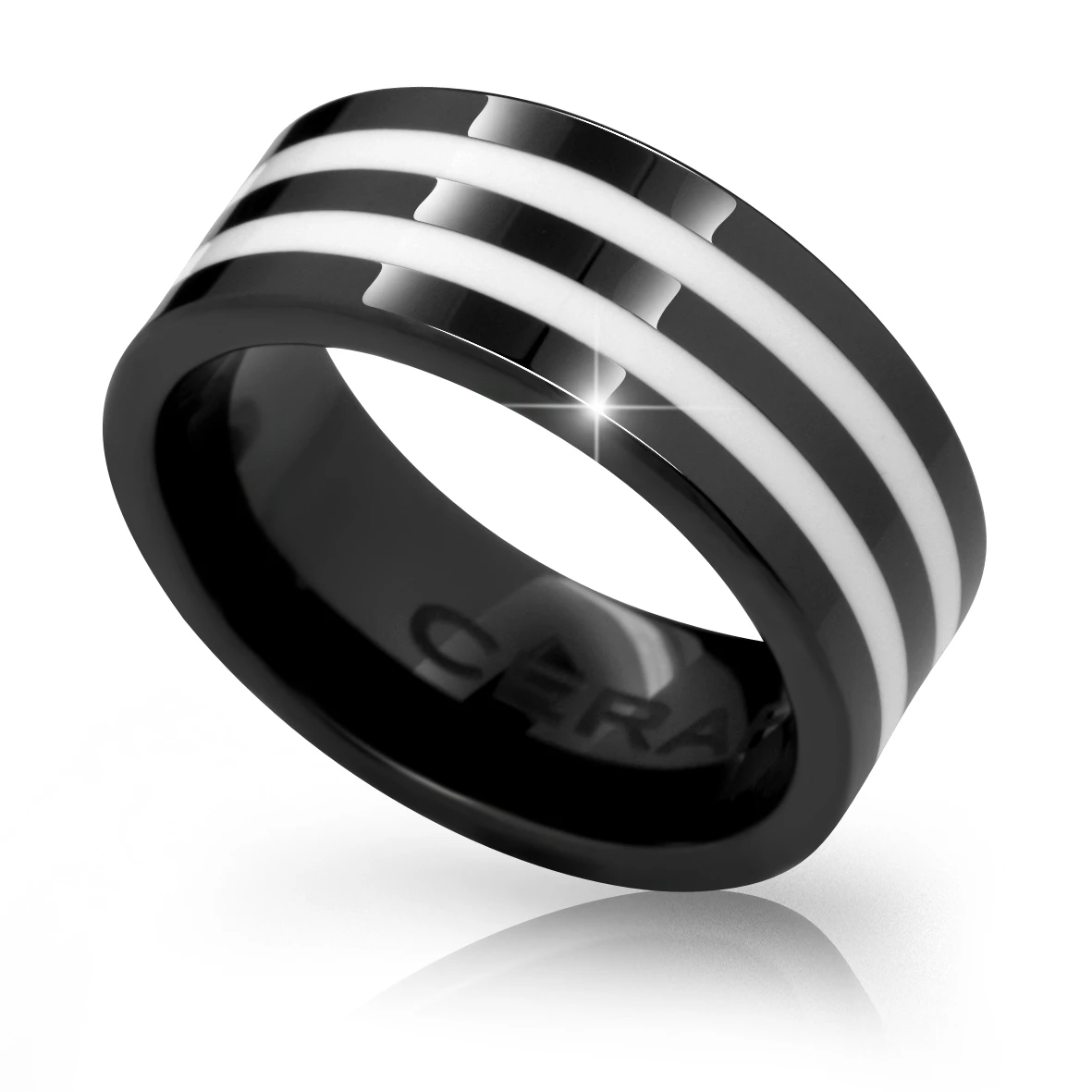 Dámský prsten z černé a bílé keramiky. Povrch prstenu je leštěný hladký. Šířka prstenu 8mm.