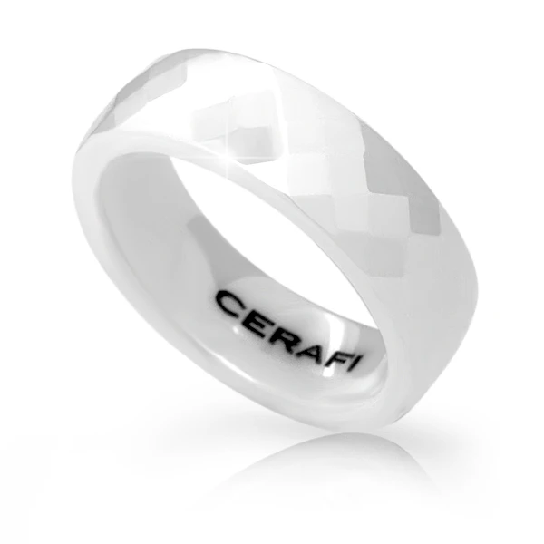 Dámský prsten bílé barvy z keramiky. Povrch prstenu je pokrytí mnoha fasetami, které vytvářejí jedinečný lesk. Prstýnek je široký 6mm.
