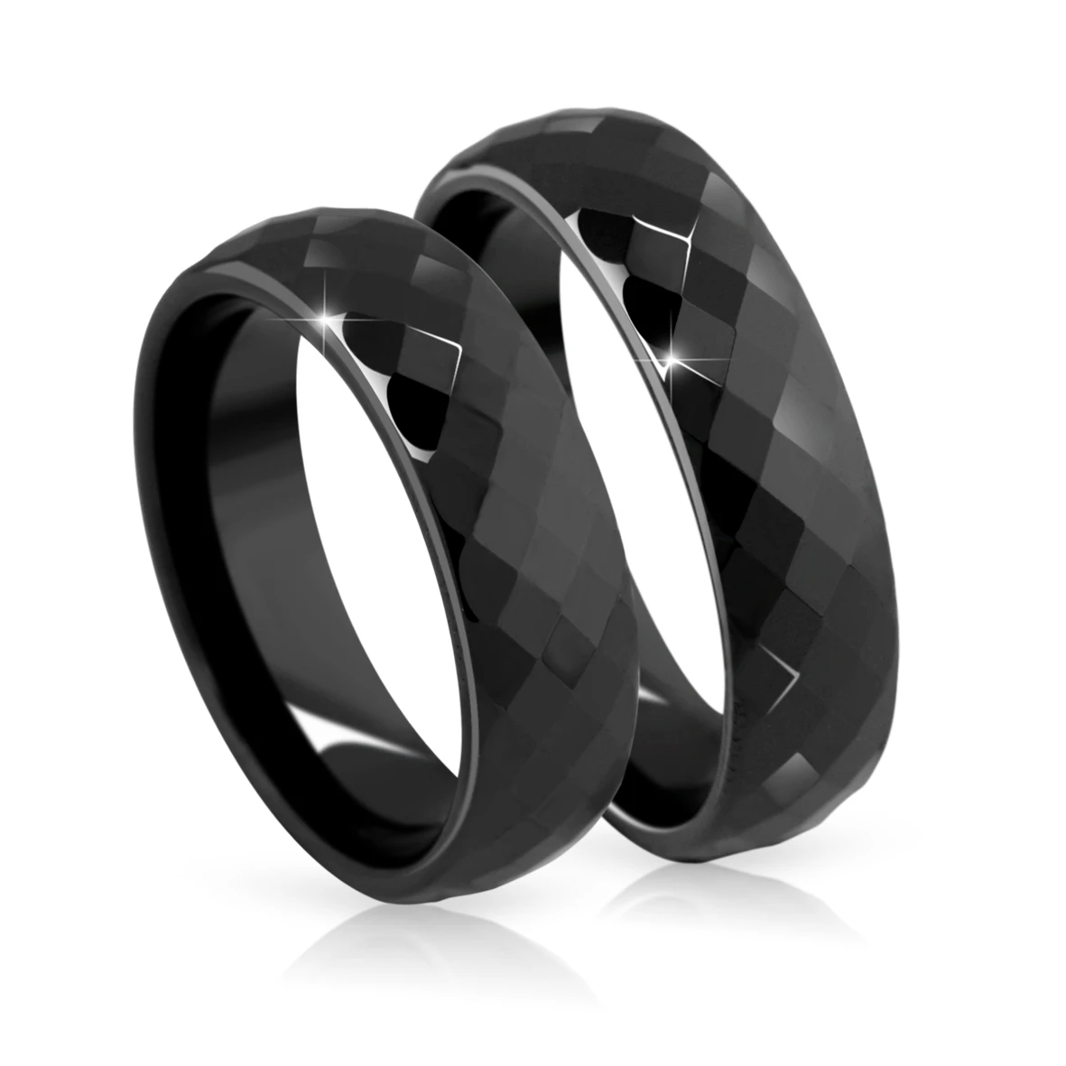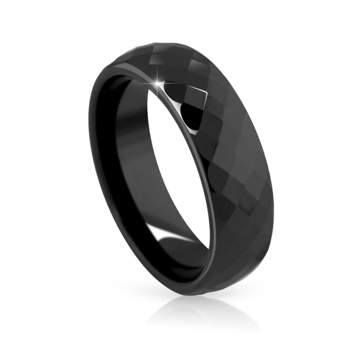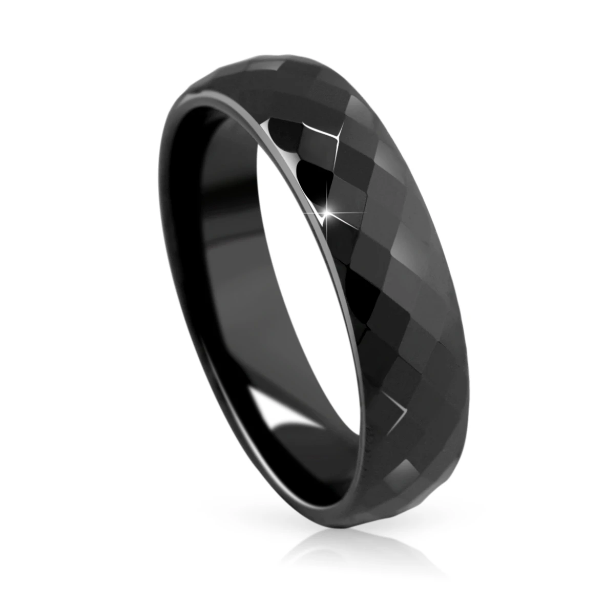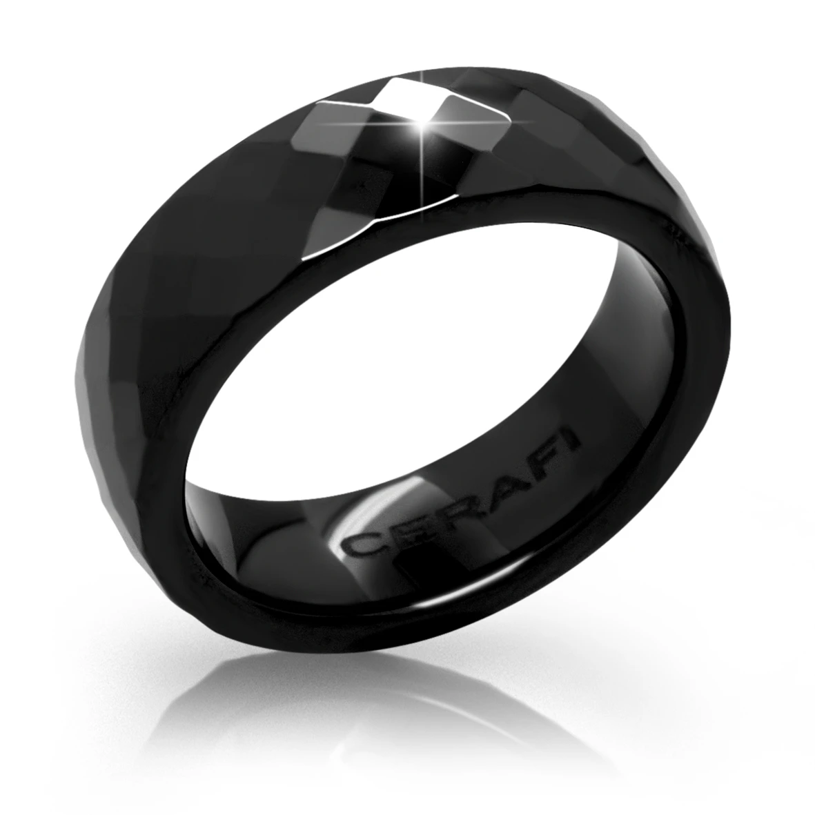 Dámský prsten z černé keramiky. Povrch prstenu je pokrytí mnoha fasetami, které vytvářejí jedinečný lesk. Prstýnek je široký 6mm.