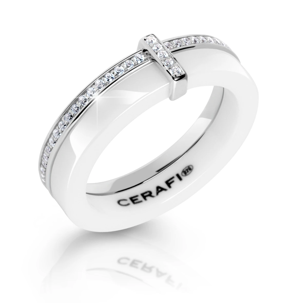 Dámský prsten z bílé keramiky a stříbra 925/1000. Povrch prstenu je hladký s vysokým leskem. Prstýnek je široký 5mm. Ozdoba a obroučka jsou osazené zirkony zasazenými do rhodiovaného stříbra. Úprava rhodiovaním dodává ozdobě jasnou barvu s leskem.