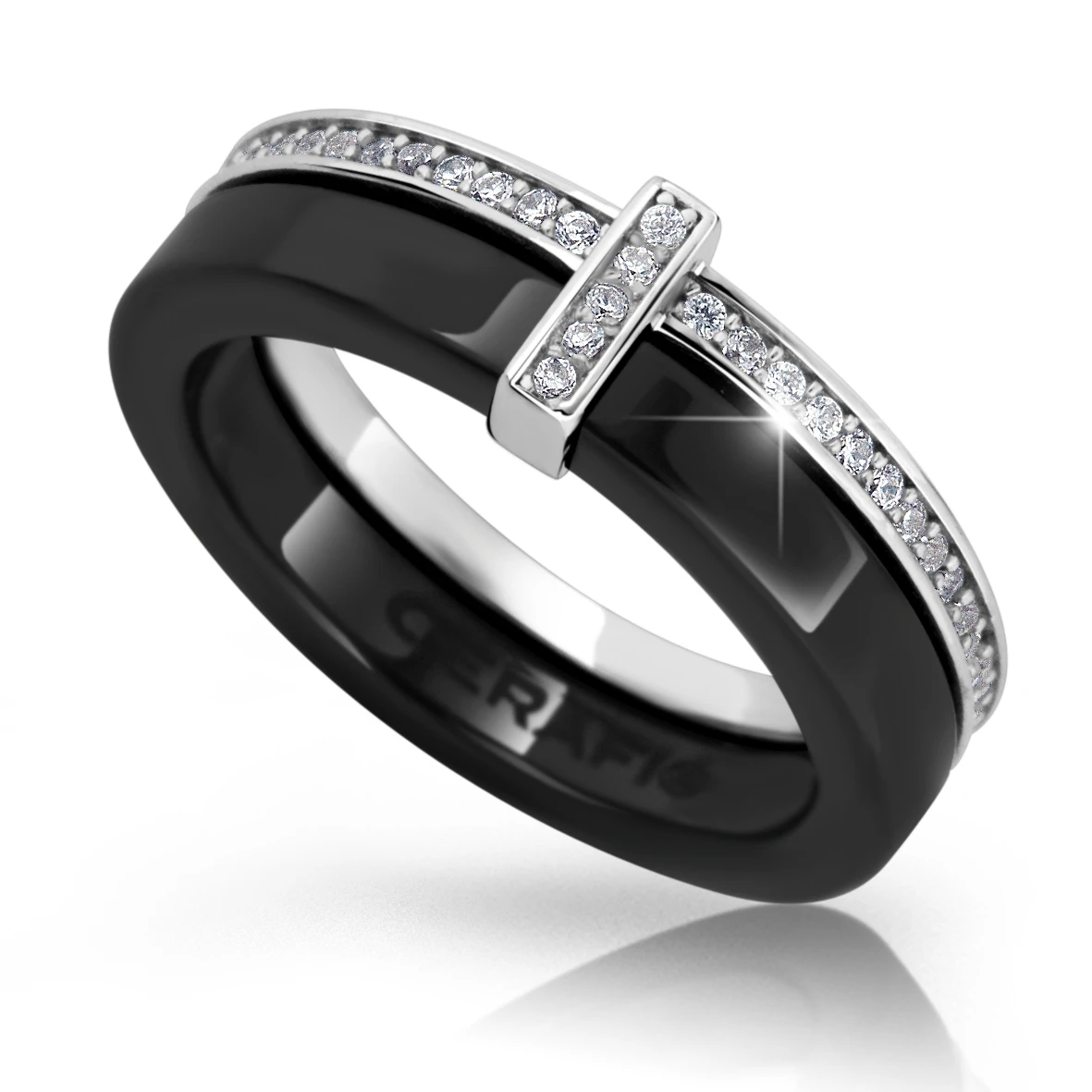 Dámský prsten z černé keramiky a stříbra 925/1000. Povrch prstenu je hladký s vysokým leskem. Prstýnek je široký 5mm. Ozdoba a obroučka jsou osazené zirkony zasazenými do rhodiovaného stříbra. Úprava rhodiovaním dodává ozdobě jasnou barvu s leskem.
