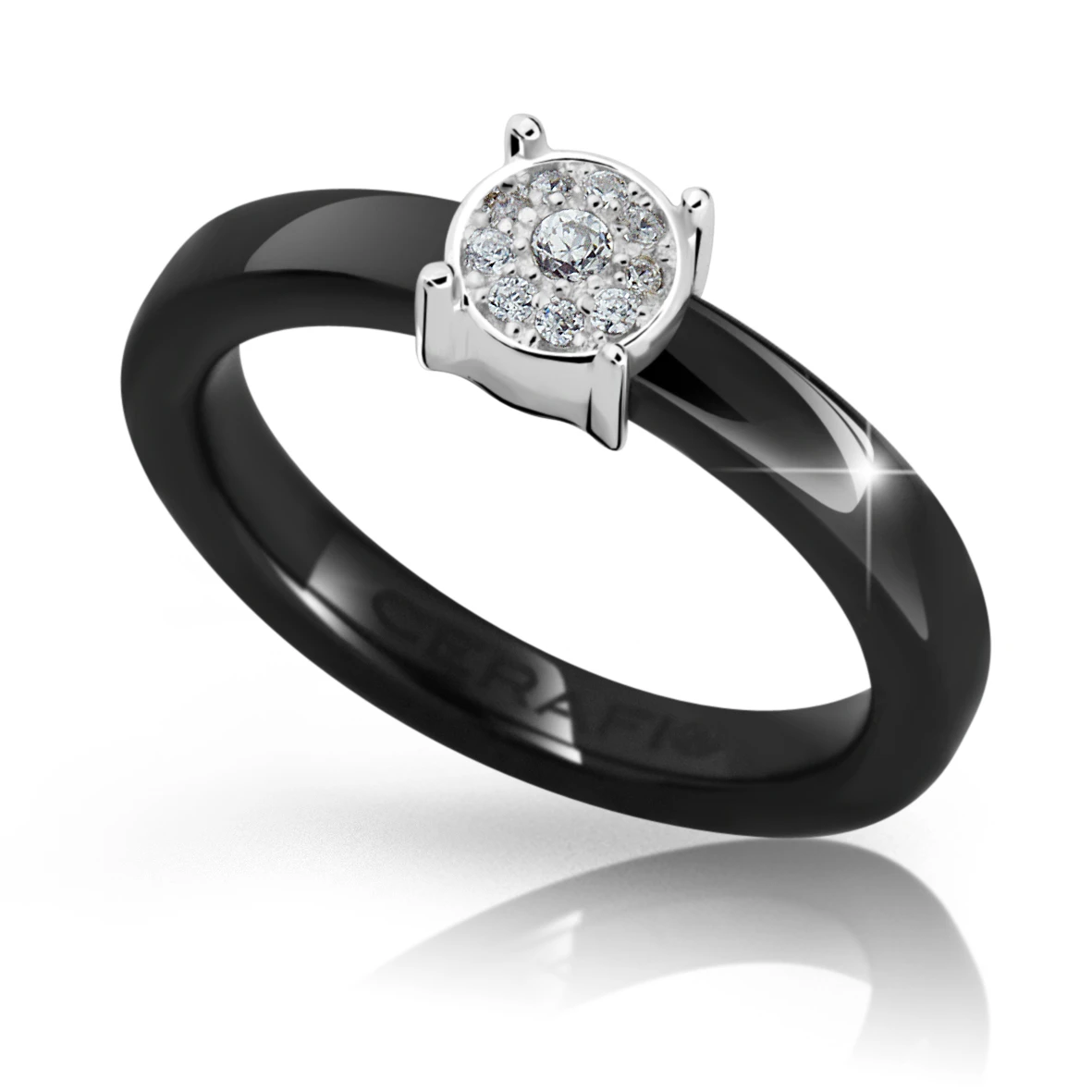 Dámský prsten z černé keramiky. Povrch prstenu je hladký s vysokým leskem. Prstýnek je široký 3mm. Prsten je ozdobený zirkony zasazenými do rhodiovaného stříbra. Úprava rhodiovaním dodává ozdobě jasnou barvu s leskem.