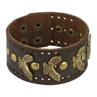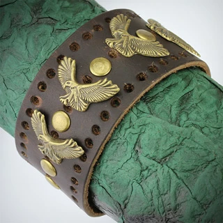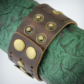 Náramek z pravé kůže. Náramek má hnědou barvu. Náramek je ozdobený kovovým cvočky a orly. Náramek je široký 37mm. Náramek se zapíná pomocí patentek. Zapínání náramku je na úrovni délek 19cm, 20cm, 22cm.