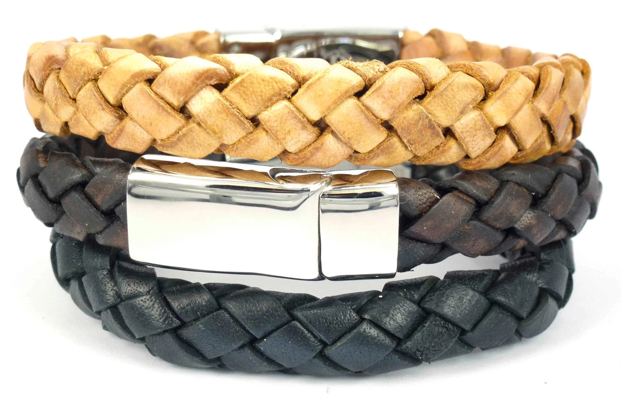 Kožený náramek pro muže. Náramek tvoří oválný spletenec kůže široký 11mm. Masivní ocelové zapínání má leštěný povrch. Délka náramku 21cm. Krásný pánský kožený náramek.