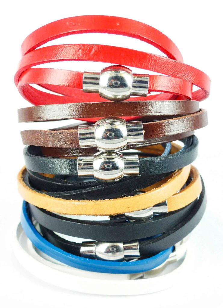 Náramek Bandito. Náramek je kombinace kůže a chirurgické oceli 316L. Náramek tvoří kožený pruh široký 4mm, který obtočíte třikrát kolem zápěstí. Ocelové magnetické zapínání má leštěný povrch. Hezká kombinace chirurgické oceli a kůže. Pokud náramek obtočíte třikrát kolem zápěstí, odpovídá vnitřní průměr délce cca 19cm.