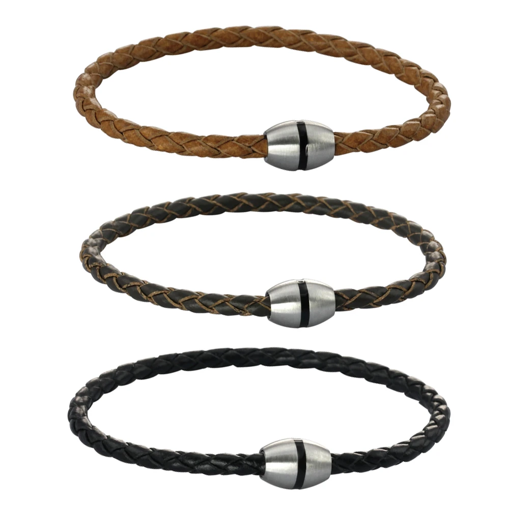 Kožený náramek pro muže s magnetickým zapínáním. Zapletená kůže má průměr 4mm, matné magnetické zapínání s černým proužkem má průměr 10mm, šířku 13mm. Náramek je dlouhý 21cm.