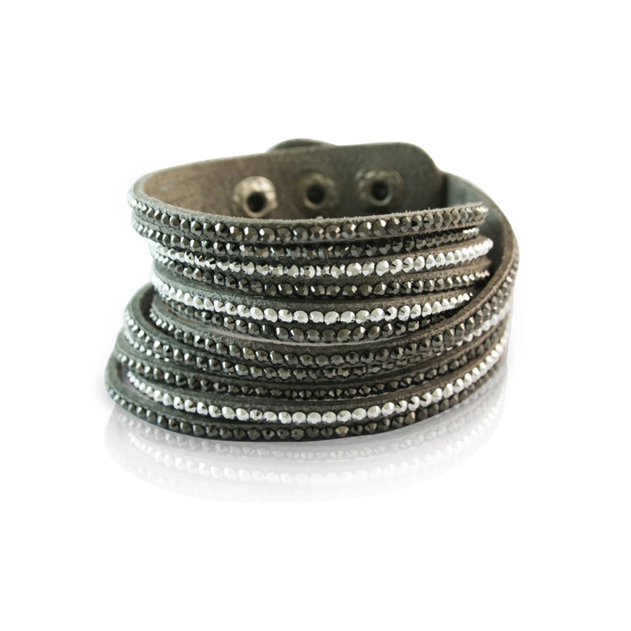Dámský náramek z umělé kůže ozdobený zářivými kamínky. Náramek lze zapnou na úrovni délek 17,18,19cm. Náramek je po ovinutí zápěstí široký 35 mm.