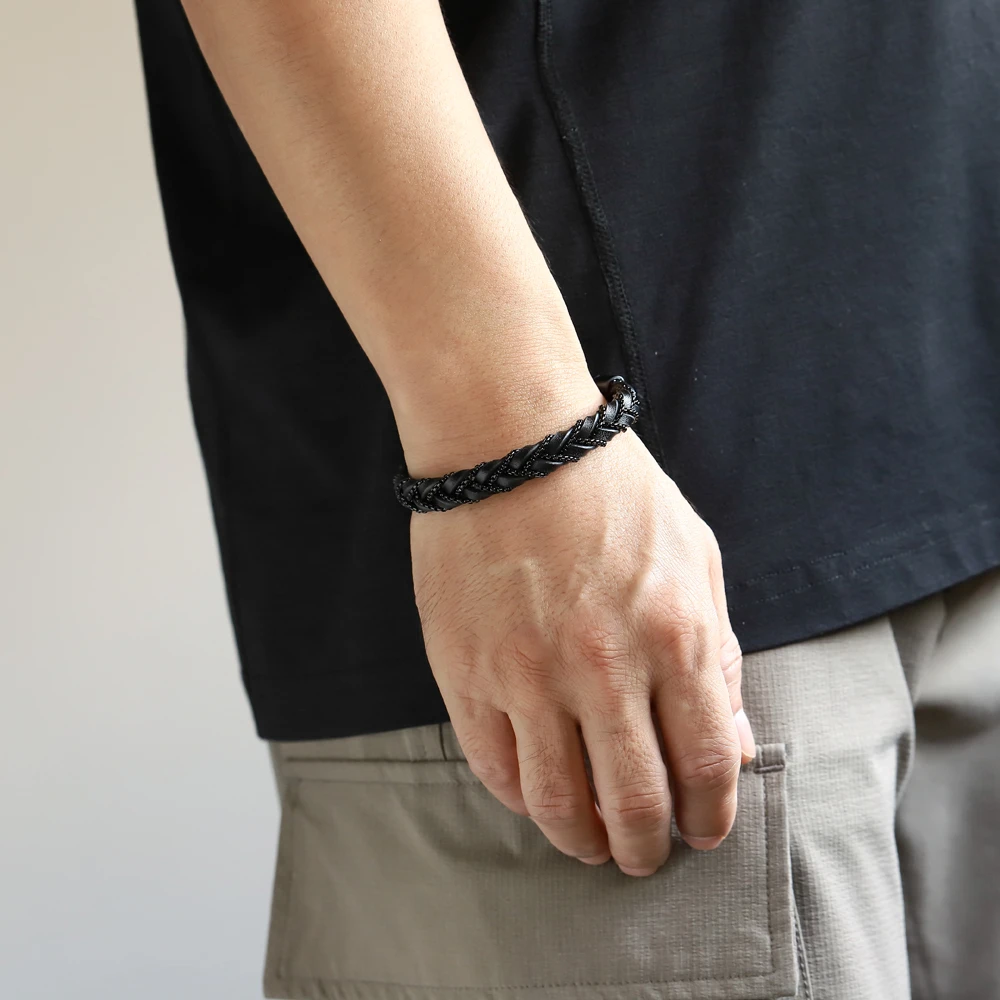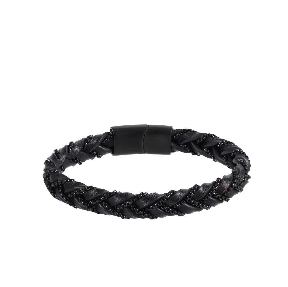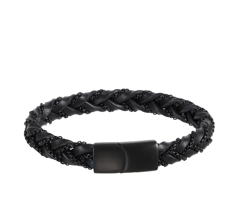 Pánský náramek na ruku z pravé kůže a chirurgické oceli. Mezi kožené části náramku je zapletený ocelový řetízek v černé barvě. Náramek je široký 10 mm, délka náramku 21 cm. Zapínání náramku je magnetické.
